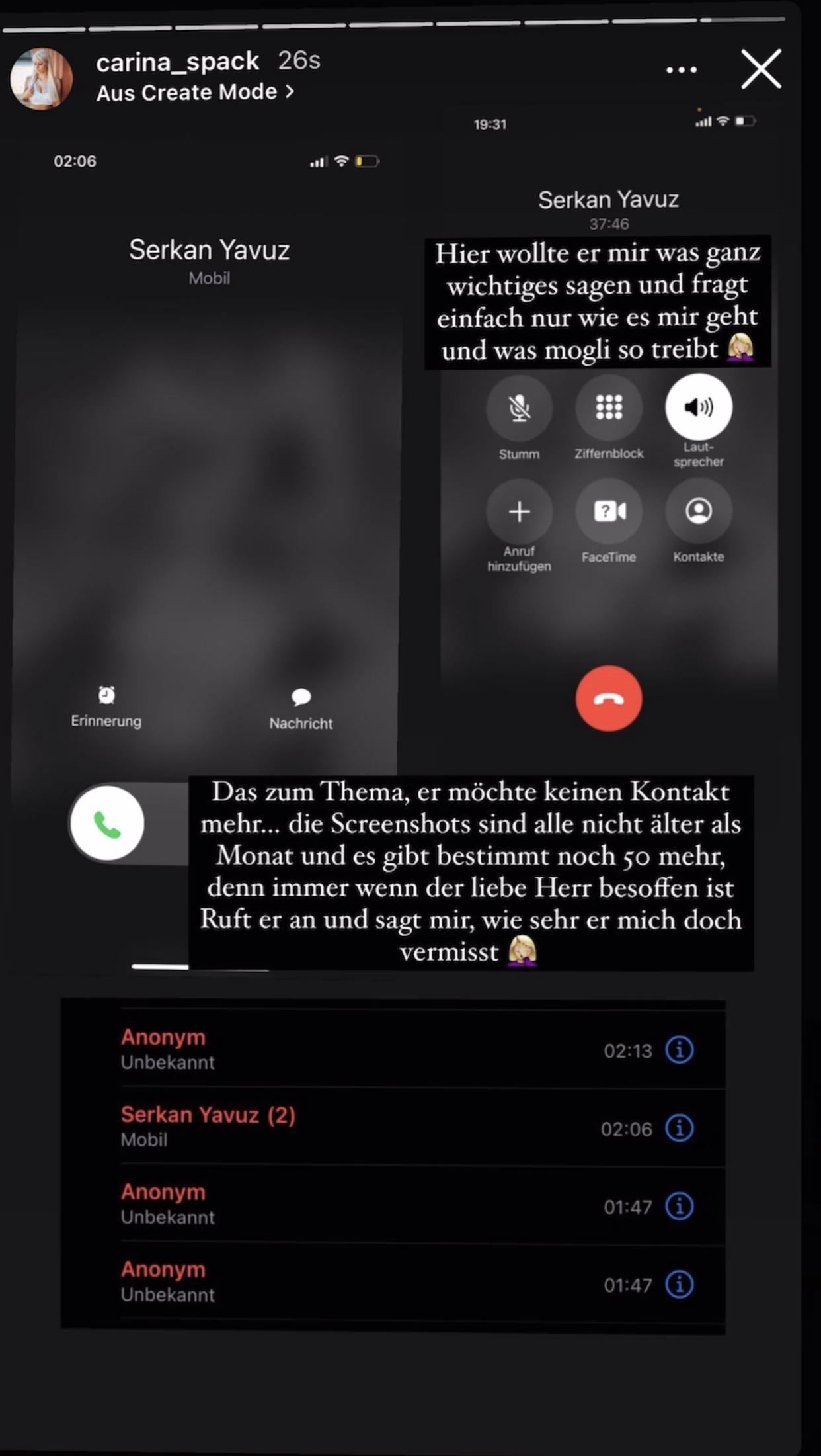 Diese Worte sind inzwischen auch bei Carina Spack angekommen und sie schießt daraufhin zurück! Auf Instagram veröffentlicht die Ex von Serkan Screenshots, die zeigen sollen, dass Serkan sie immer noch betrunken anruft und den Kontakt zu Carina sucht.